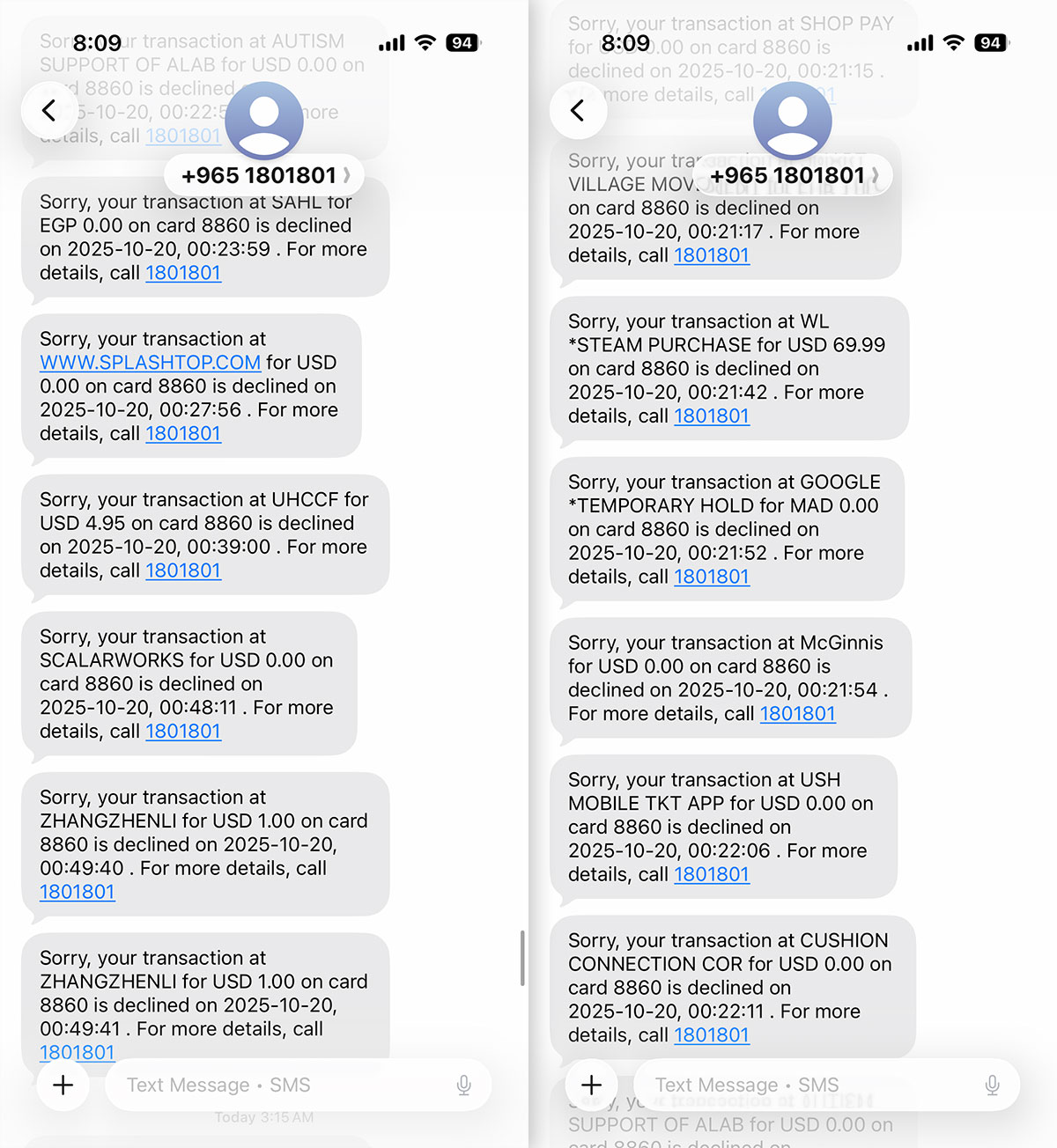 I woke up this morning to find 48 credit card transaction messages from NBK. It was a bit confusing at first because my iPhone had grouped up all the messages and given me a summary and I thought at first it was one declined transaction. But, I quickly realized it was more than one transaction and that my card had been compromised. The first thing I did was log into my NBK app and block the card until I could wake up and figure out what was going on.