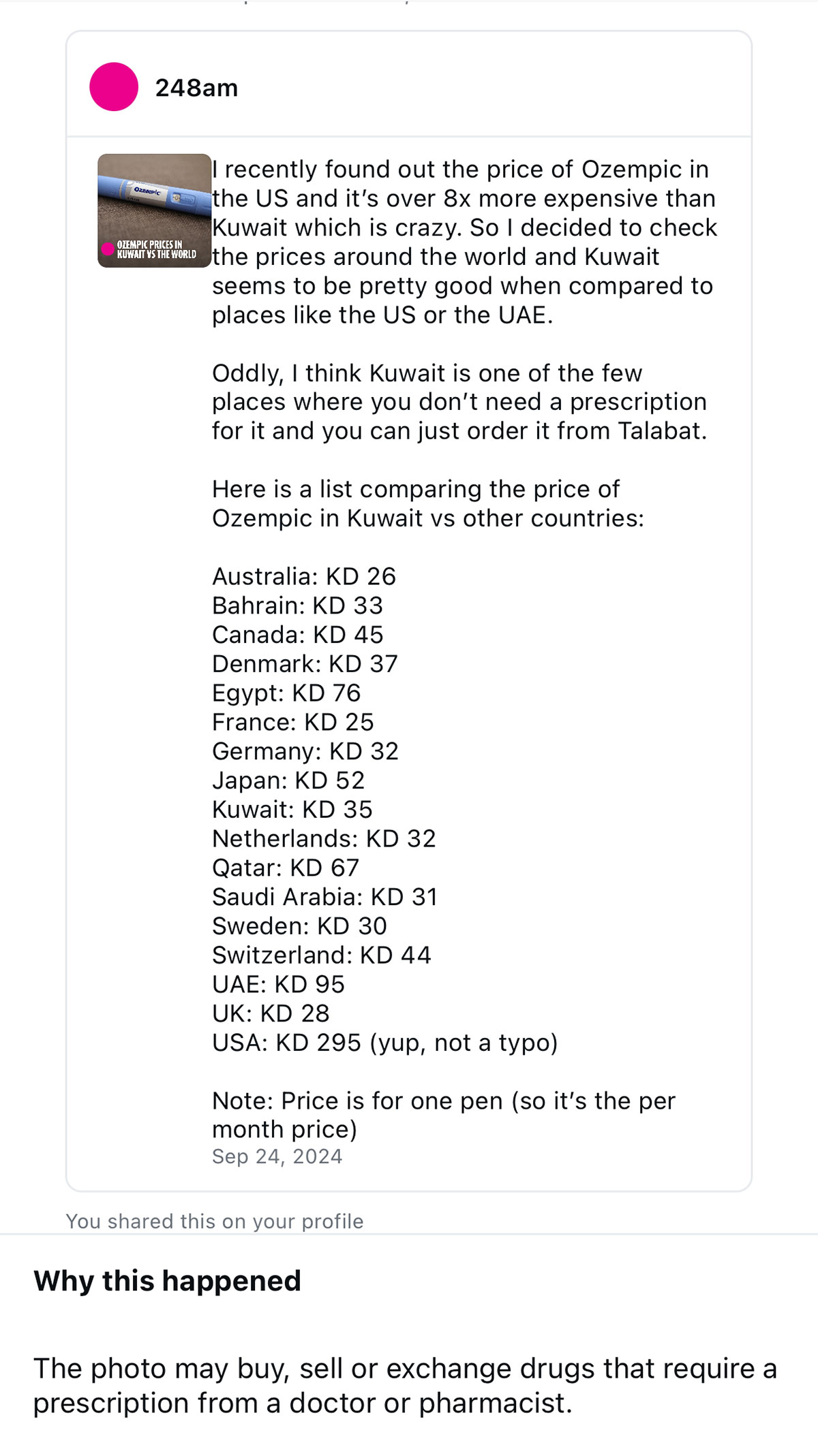 On Friday, I woke up to a notice from Instagram saying they had removed one of my posts for violating community standards. Apparently, their AI misread my post about Ozempic prices in Kuwait versus other countries and thought I was “selling prescription weight-loss injections.”