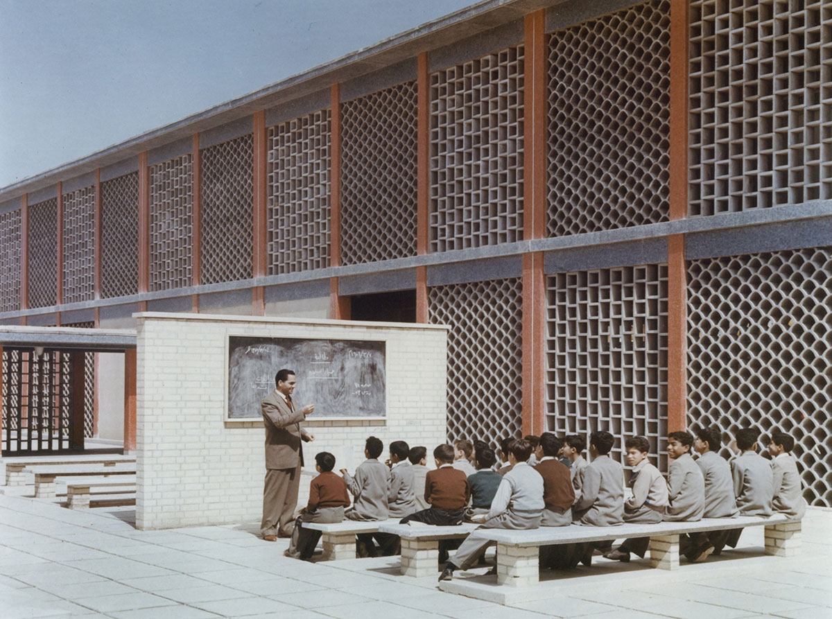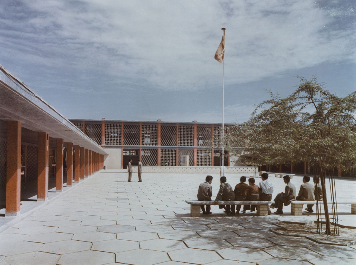 The Al-Shamiya School for Boys, along with two other elementary schools, a technical college and five nurseries were designed by the British architectural firm Tripe & Wakeham in the 1950s. T&W were appointed by the Emir to design and build a series of ‘western standard’ educational facilities based on the requirements drafted by the Council of Education.