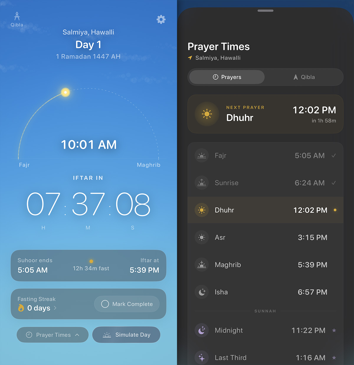 Forsan wanted the app to feel calm and have an animated live sky that changes from Suhoor to Iftar throughout the day. It has a clean countdown, no clutter and the following features: