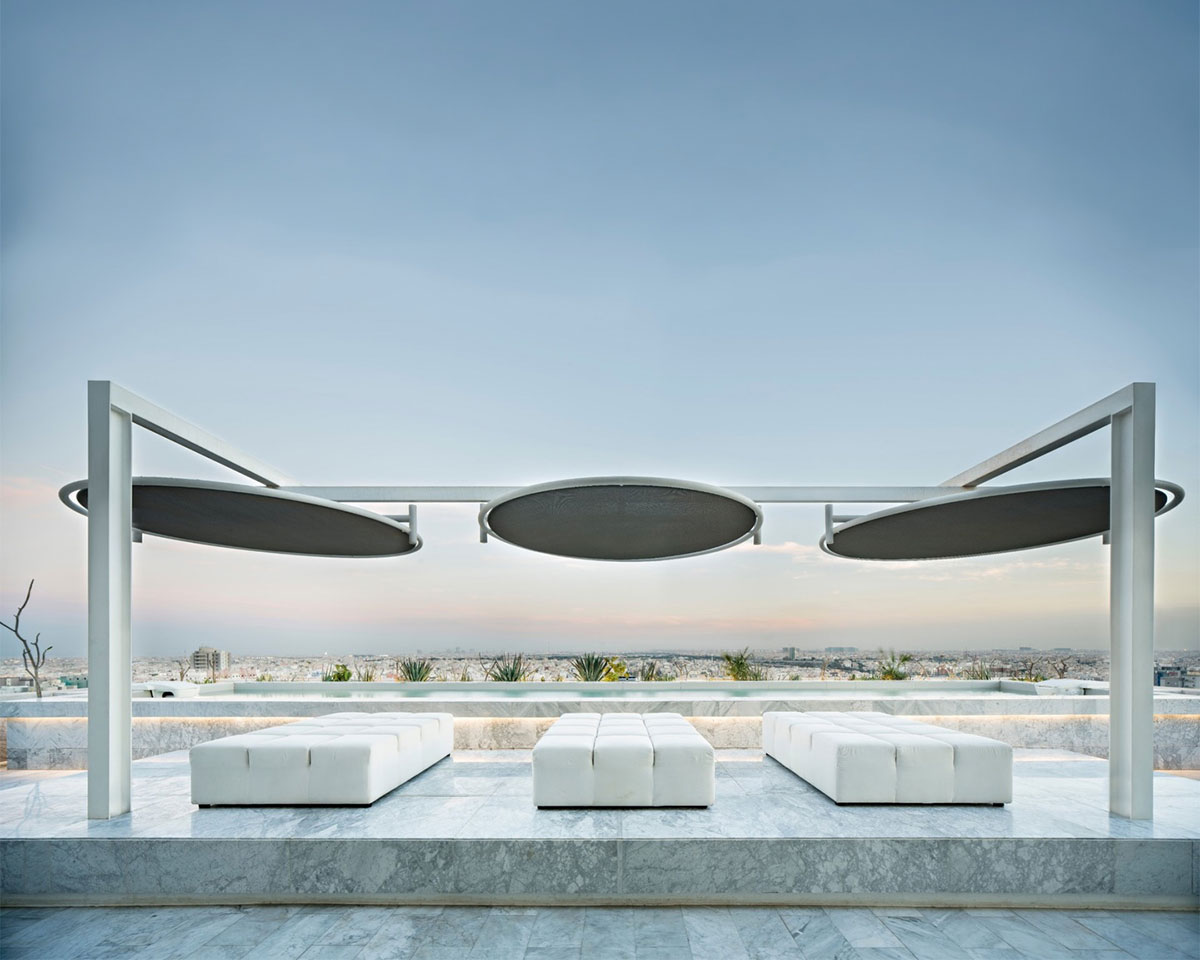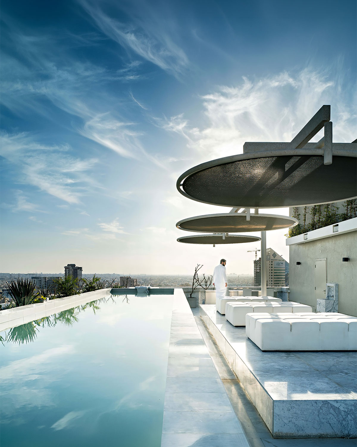 The pool is located on the rooftop of an unassuming building in Jabriya. The building and rooftop were designed by the architecture and interior design firm ARCHJS and is part of a private residence. The view looks incredible and even though it’s in Jabriya, it wouldn’t look out of place in Palm Jumeirah.