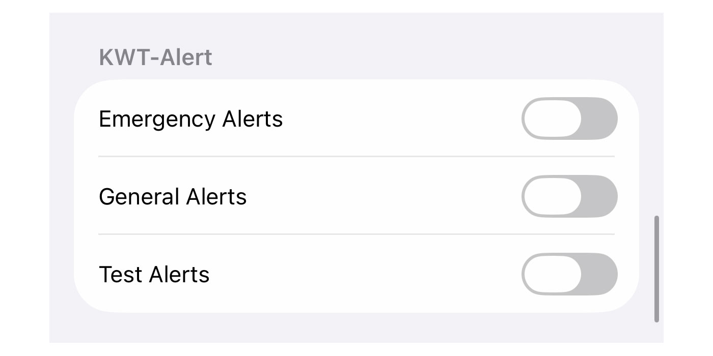 This is the only way I found to turn off these alerts, switching off cellular. Every other way didn’t work including turning off “Critical Alerts” or the “KWT-Alerts” under notifications, at least on iPhones.