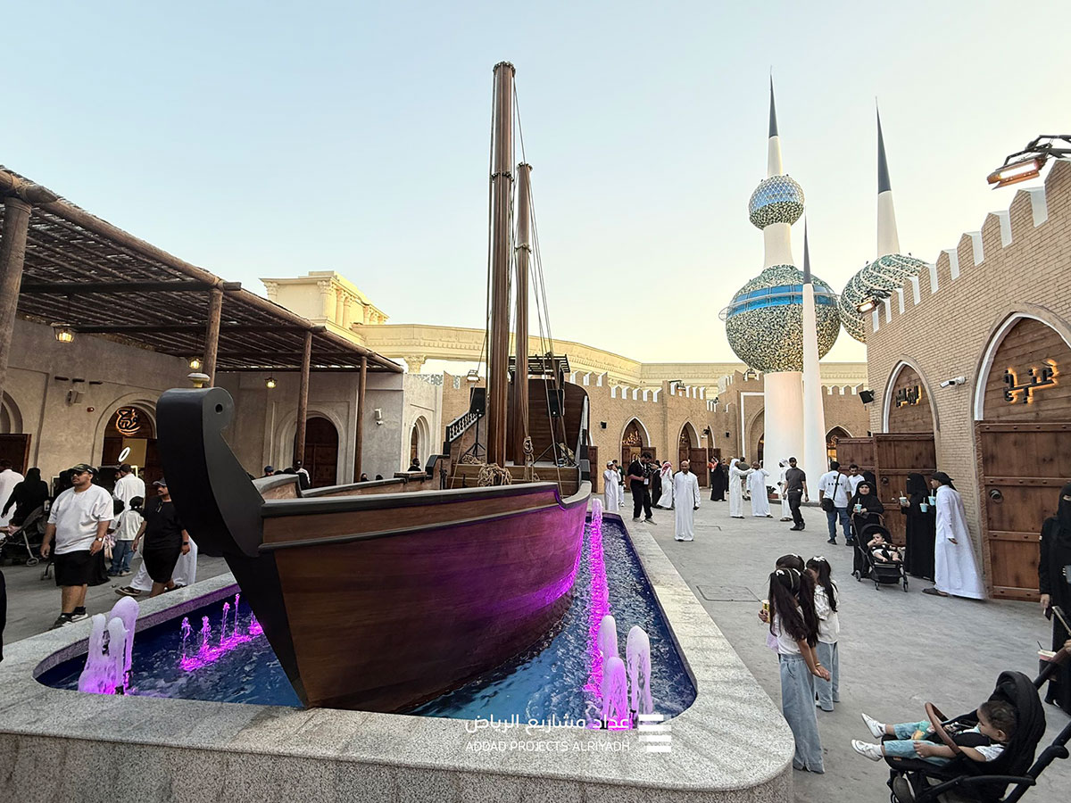 The Kuwait zone features replicas of the Kuwait Towers, Seef Palace with its clock tower, and a large dhow. It also includes restaurants serving authentic Kuwaiti food, along with traditional arts and live performances.