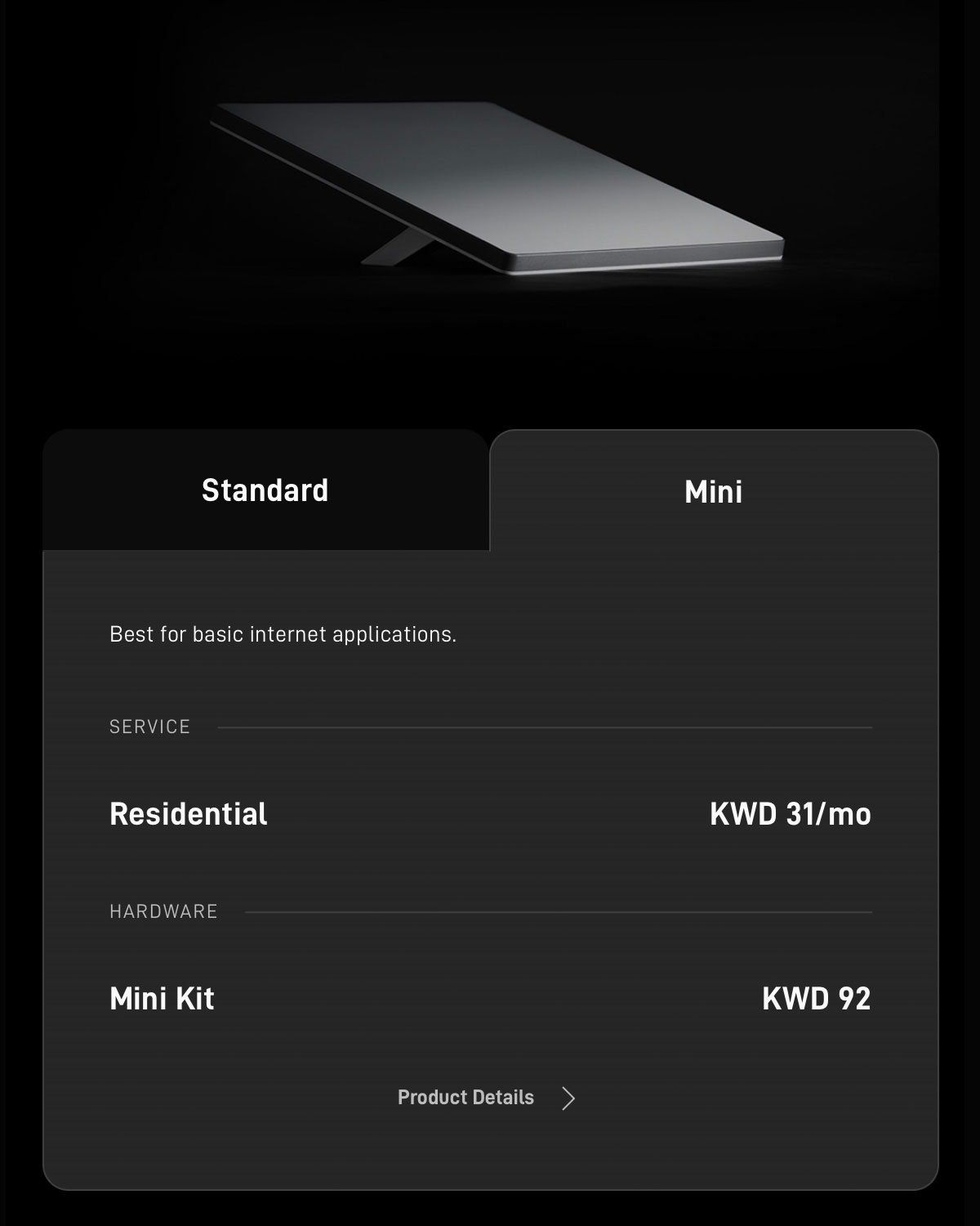 There are two types of devices you can purchase to get started, the Standard or the Mini. The Standard device costs KD122 and is meant to be permanently fixed. The Mini, on the other hand, is a smaller portable device that you can mount at your home but also take with you anywhere you go. The Mini device costs KD92.