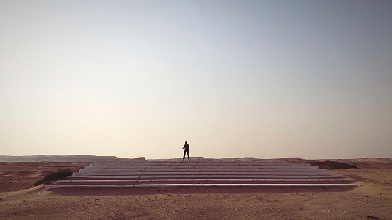 The stairs to nowhere are located on the side of the highway that leads to Boubyan island. It’s adjacent to a large metal structure which I believe was used for a military parade a few years ago. Because of the metal structure, the stairs are pretty easy to find, if the metal structure is on your right, the stairs are right after it.