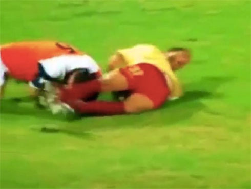 Both players fall to the floor after contesting an aerial ball, and one doesn’t take too kindly to the challenge as he commits what might just already be the weirdest foul of the season.