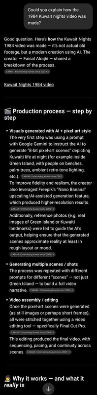 For the pixel-art images, he used the Google Gemini app along with Freepik’s Nano Banana feature. Freepik gave him higher-resolution results, which made a big difference when putting everything together into a video. He also added reference photos he found on Google, like shots of Green Island, to help the AI recreate the scenes more accurately.